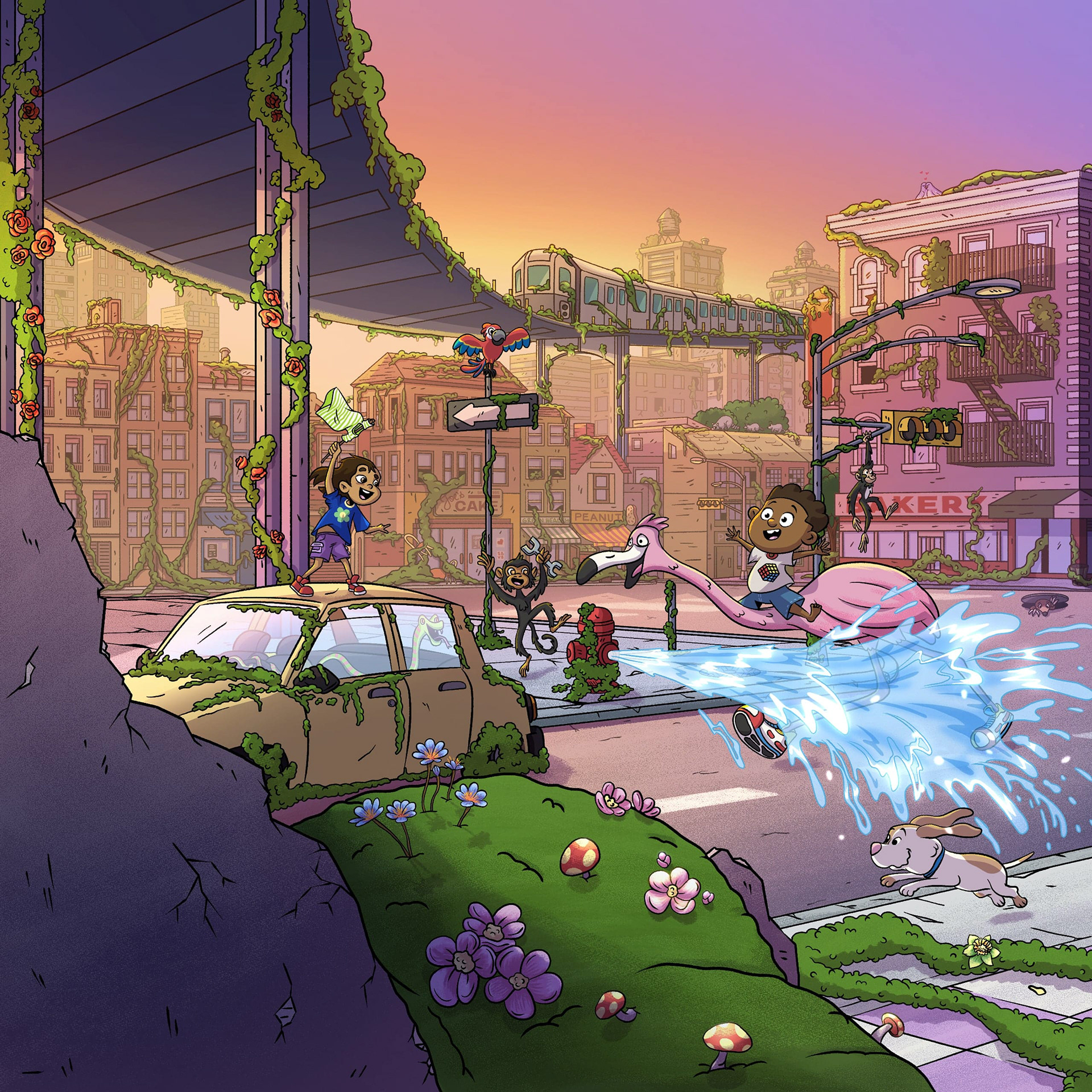[PT BR] - Esta é uma ilustração para livro infantil em que buscamos capturar a espontaneidade e a alegria das crianças se conectando com o cenário fantástico de uma cidade tomada pela natureza. É impossível não acreditar nessa conexão natural entre elas e os animais nesse ambiente livre e imaginativo.